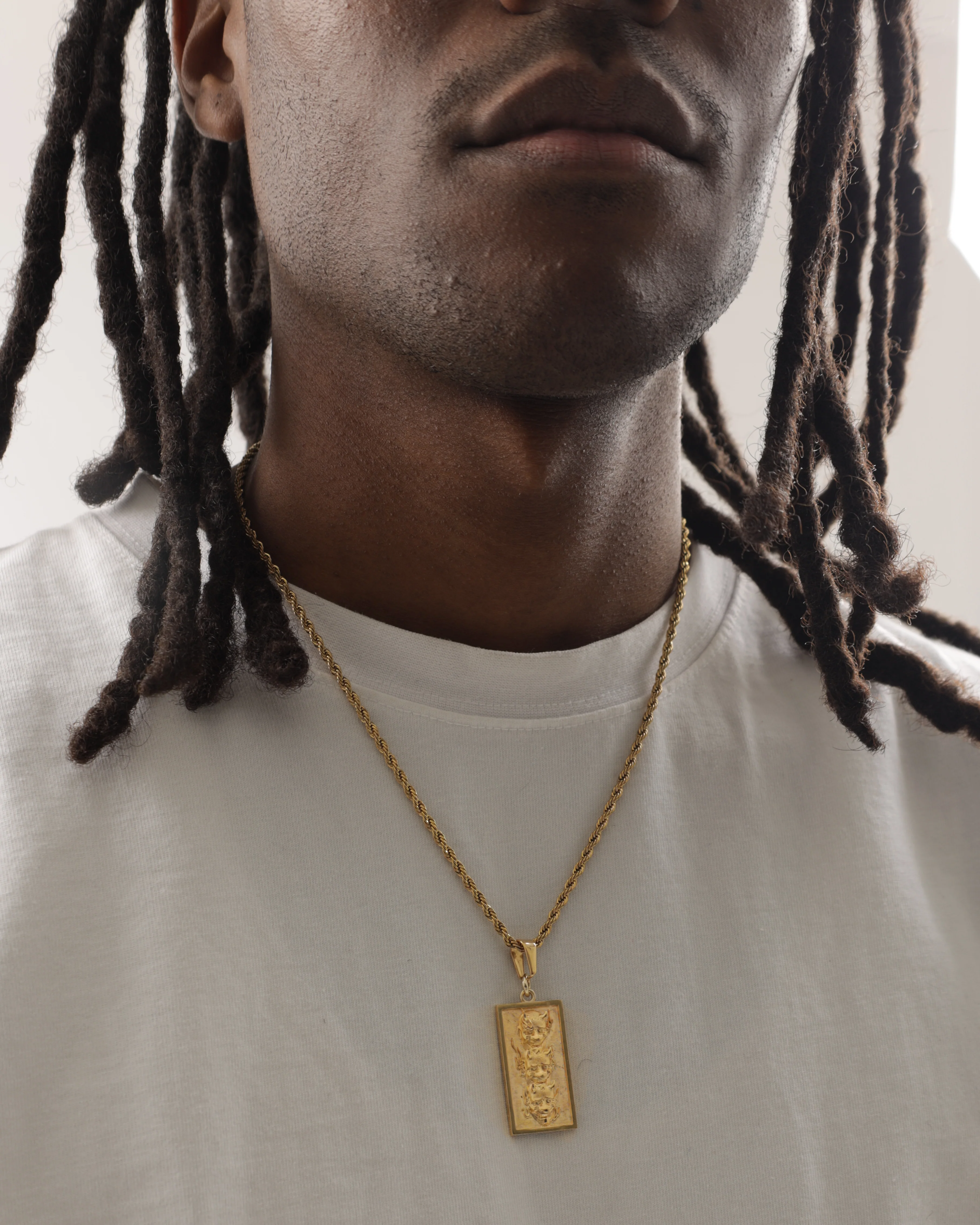 A very special pendant. It features three Japanese masks inspired by traditional tattoos. It's also made of 18k gold-plated stainless steel, making it a pendant that won't fade and will last a lifetime.
