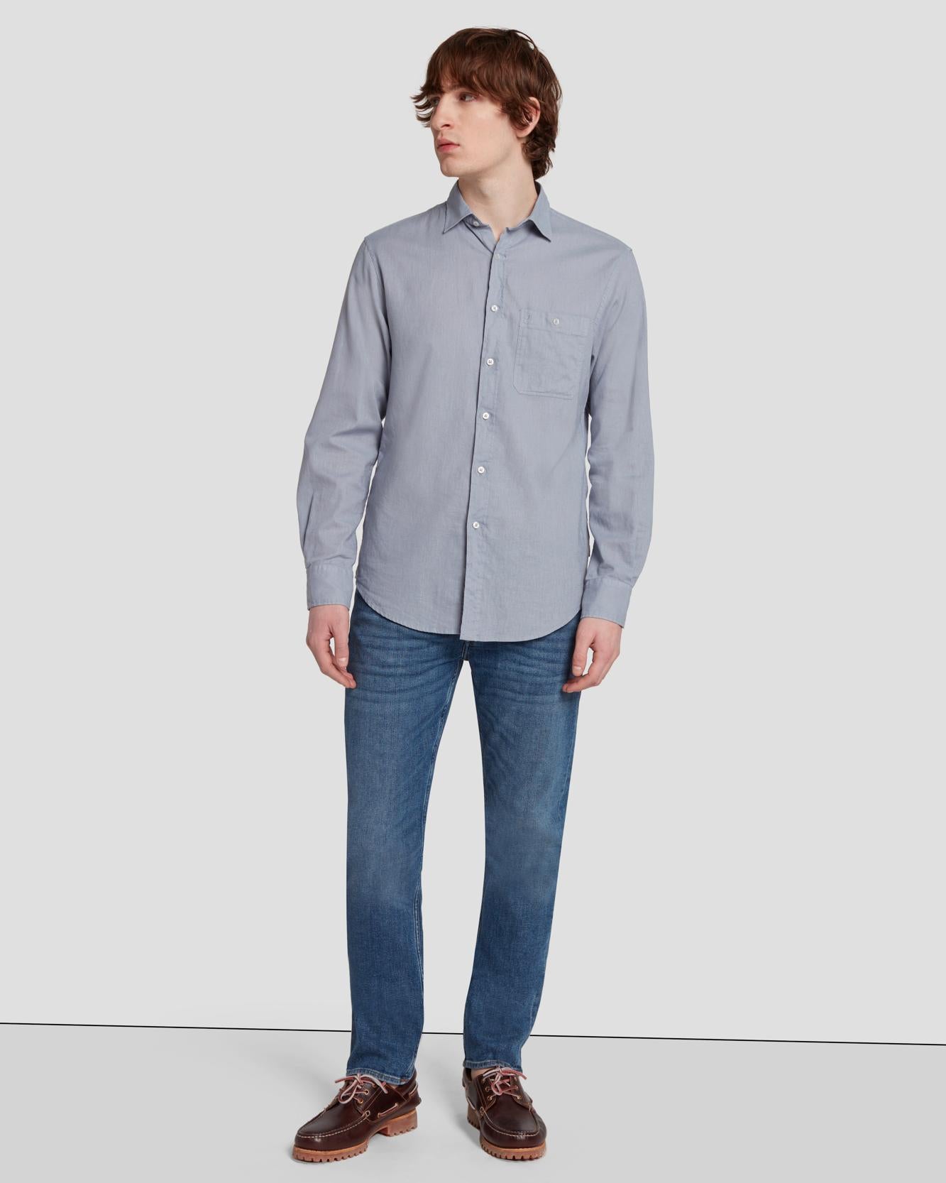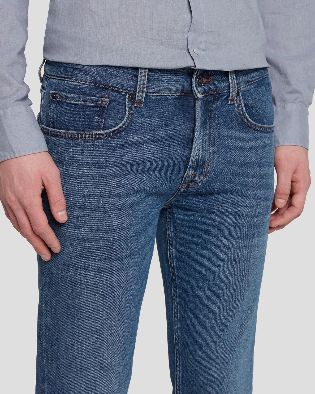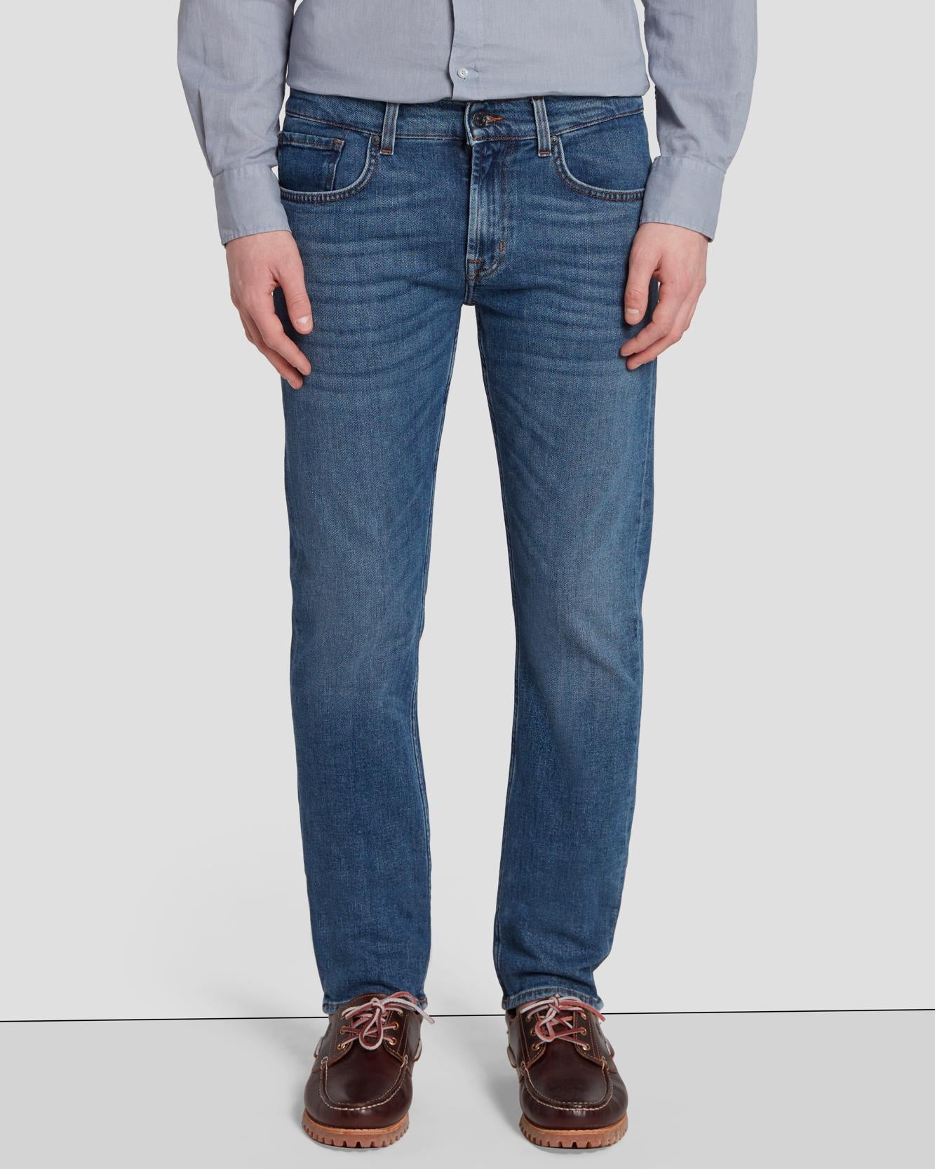 A sleek, slim fit from hip to hem, for a look that's streamlined but not too skinny. This medium blue wash features heavy whiskering and sanding for that lived-in look, while our iconic 7 squiggle embroidery on the back pocket adds our signature touch.