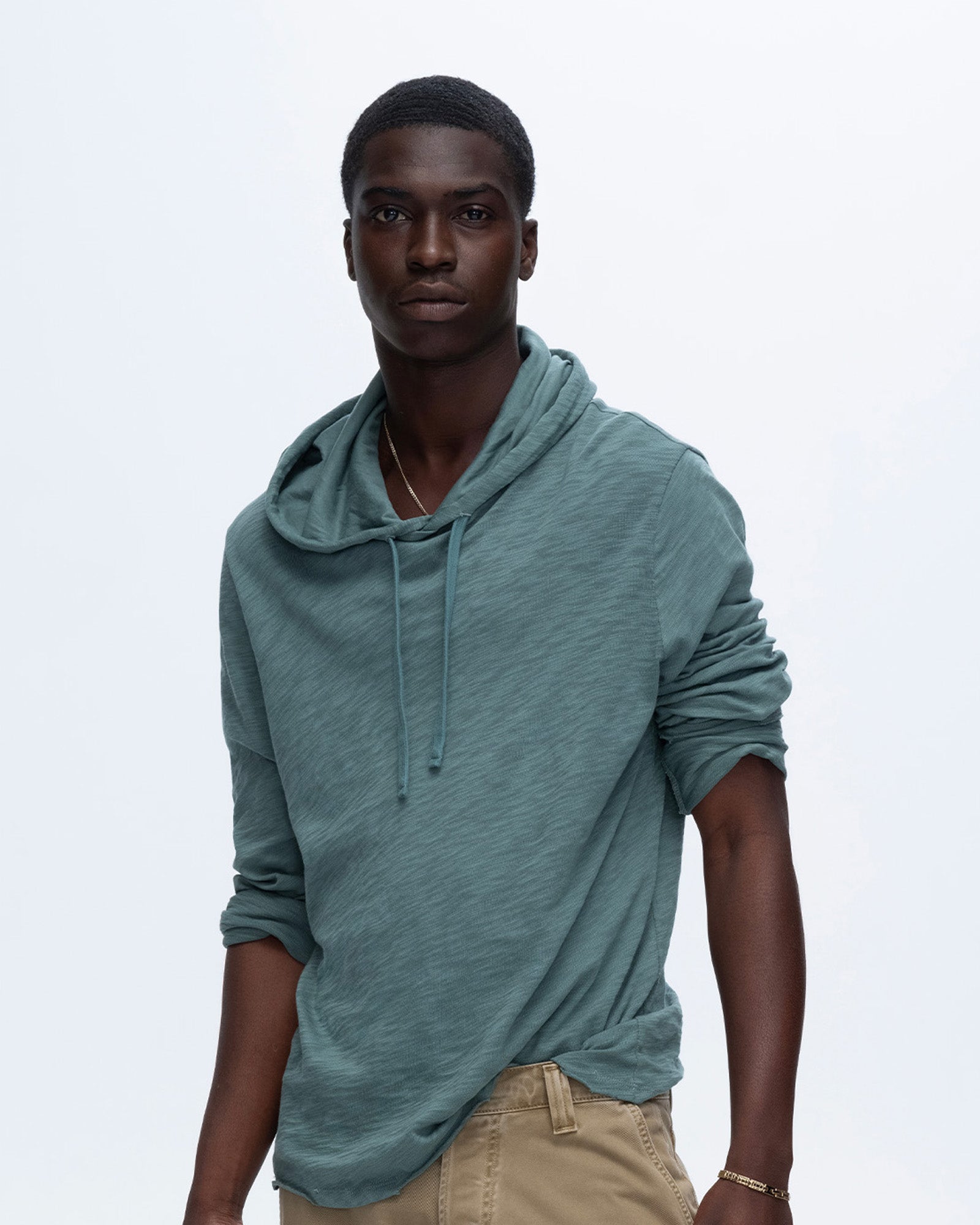 The Slub Jersey Long Sleeve Destroyed Hoodie is effortlessly laid-back with a touch of edge. Made from 100% cotton, it features a pullover neckline, raw hemline, and an adjustable drawstring hood for a customizable fit. With its relaxed silhouette, this hoodie is the perfect lightweight layer for easy, everyday wear.