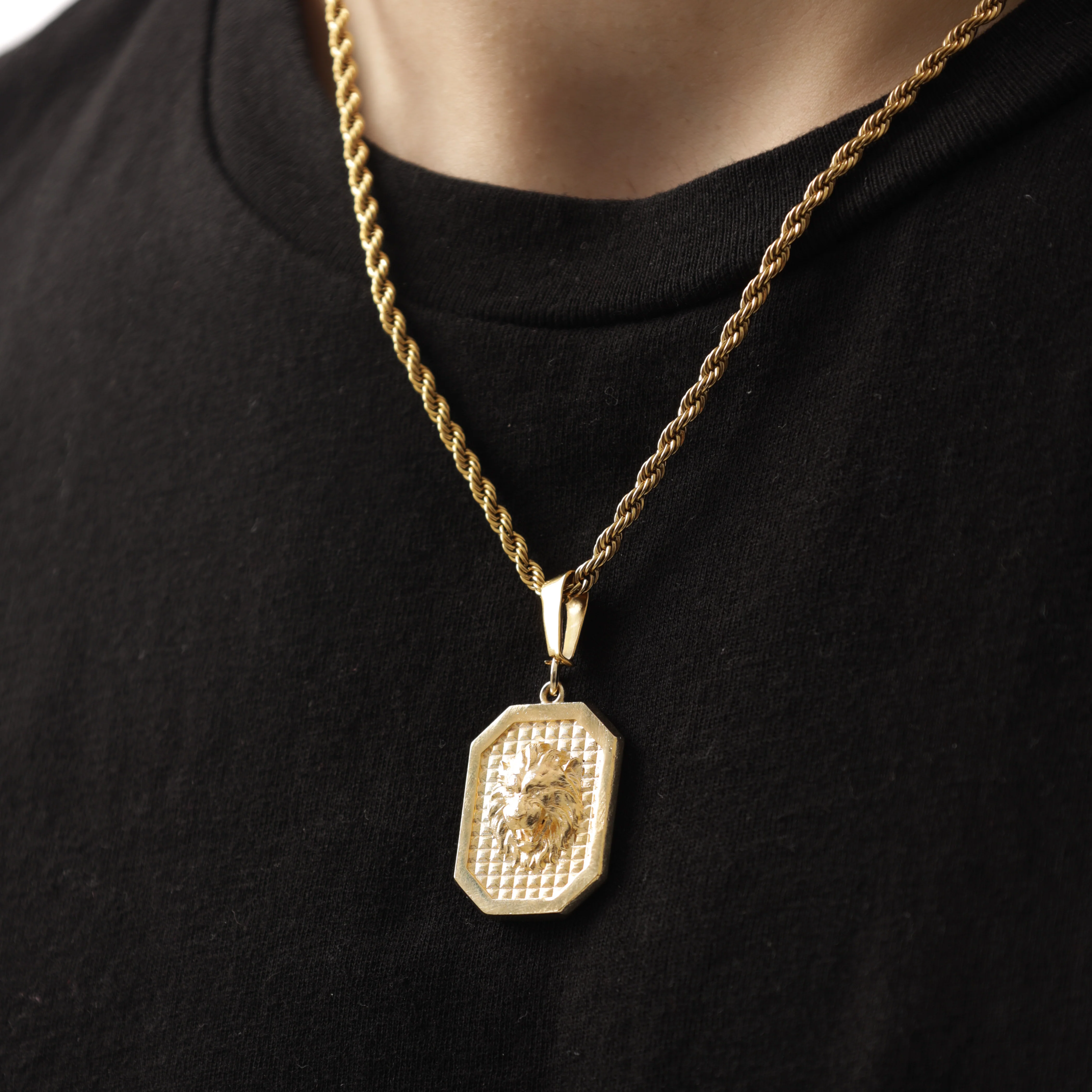 A classic pendant redesigned for modern times. It features a medallion topped by a powerful lion. It's made of 18k gold-plated stainless steel, so its quality and shine shine through.